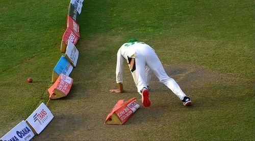 ऑस्ट्रेलियाई टीम इस समय पाकिस्तान के दौरे पर है। दोनों टीमों के बीच तीन टेस्ट मैचों की सीरीज का पहला मुकाबला 4 मार्च से रावलपिंडी में खेला जा रहा है। आज खेल का पांचवां और आखिरी दिन है। मैच तेजी से ड्रॉ की ओर बढ़ रहा है। इस वक्त मुकाबला भले ही बेरंग नजर आ रहा हो, लेकिन चौथे दिन मैदान पर एक मजेदार घटना हुई। ऑस्ट्रेलियाई पारी के 123वें ओवर में गेंदबाजी का जिम्मा नौमान अली को सौंपा गया। ओवर की 5वीं गेंद पर ऑस्ट्रेलियाई विकेटकीपर एलेक्स कैरी ने रिवर्स स्वीप शॉट खेला।पॉइंट की ओर गई बॉल को पकड़ने के लिए वहां शान मसूद मुस्तैद थे। चौका रोकने के चक्कर में वह बाउंड्री रोप से जा टकराए। शरीर ने ऐसा रगड़ा खाया कि बायीं ओर से पैंट ही फट गई।