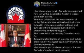 कैनेडा के संसद सदस्य, श्री चंद्र आर्य ने भी कैनेडा में खालिस्तान समर्थकों की ब्रैम्पटन परेड में फ्लोट के साथ एक नए निचले स्तर पर पहुंचने की निंदा करते हुए इस कुकृत्य की निंदा की। उन्होंने जोर देकर कहा कि कैनेडा हिंसा के महिमामंडन या नफरत को बढ़ावा देने के पक्ष में नहीं है और कैनेडा के राष्ट्रीय नेतृत्व से इस मामले पर प्रतिक्रिया की मांग की। उन्होंने कहा कि खालिस्तान समर्थकों ने हद पार कर दी है और कैनेडा को इसका जवाब देना चाहिए। श्री रितेश मलिक, राष्ट्रीय संयोजक, ने इस बात पर जोर दिया कि हिंसा, उग्रवाद और आतंकवाद के कृत्यों की सार्वभौमिक रूप से निंदा की जानी चाहिए और इसका जश्न नहीं मनाया जाना चाहिए। उन्होंने अभिव्यक्ति की स्वतंत्रता के साथ आने वाली जिम्मेदारी और जवाबदेही पर जोर देते हुए सभी कैनेडियन लोगों से ऐसी विचारधाराओं और घटनाओं के खिलाफ बोलने का आह्वान किया।