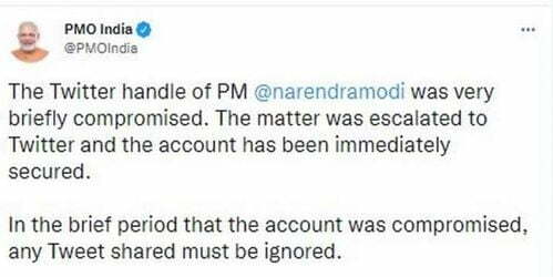 अधिक पढ़ें.. प्रधानमंत्री मोदी का ट्विटर हैंडल कुछ समय के लिए हैक, बाद में सुरक्षित किया गया : पीएमओ